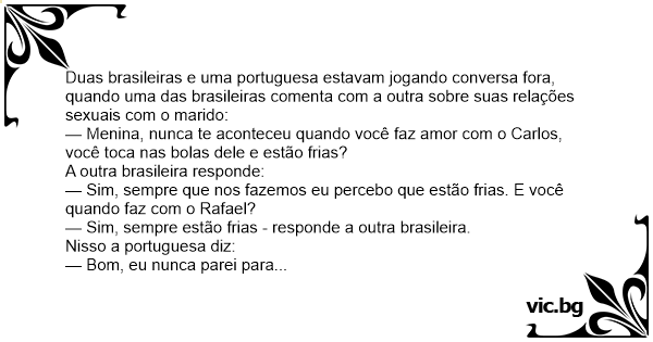 Duas brasileiras e uma portuguesa estavam jogando conversa fora, quando uma das brasileiras comenta com a outra sobre suas relações sexuais com o marido: