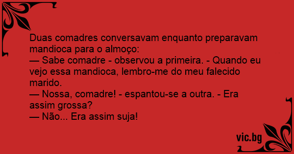 — Sabe comadre - observou a primeira. - Quando eu vejo essa mandioca, lembro-me do meu falecido marido.