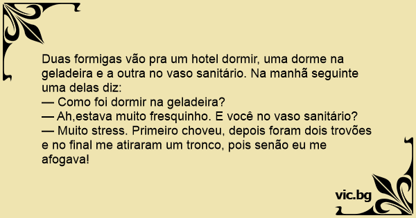 Duas formigas vão pra um hotel dormir, uma dorme na geladeira e a outra no vaso sanitário. Na manhã seguinte uma delas diz: