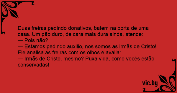 Duas freiras pedindo donativos, batem na porta de uma casa. Um pão durо, de cara mais dura ainda, atende: