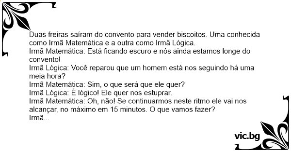 Irmã Lógica: Não é lógico, Irmã Matemática? Uma freira com o hábito levantado consegue correr muito mais rápido do que um homem com as calças abaixadas!