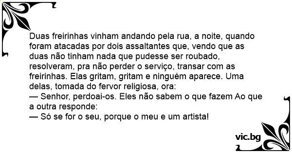 Duas freirinhas vinham andando pela rua, a noite, quando foram atacadas por dois assaltantes que, vendo que as duas não tinham nada que pudesse ser roubado, resolveram, pra não perder o serviço, transar com as freirinhas. Elas gritam, gritam e ninguém aparece. Uma delas, tomada do fervor religiosa, ora: