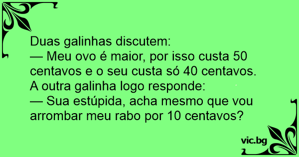A galinha de granja e a caipira conversavam: - Você viu?Meu ovo valorizou, agora está custando dez centavos! - Disse a galinha caipira. - Isso não é nada. E o meu que custa quinze centavos e é...