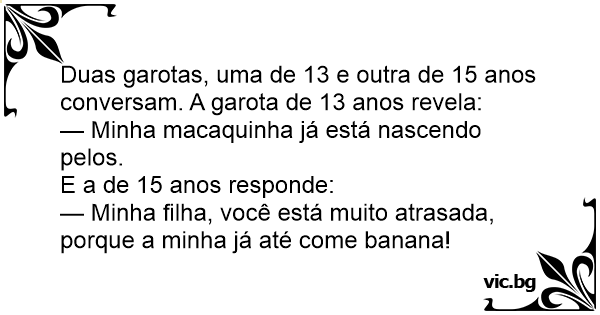 Duas garotas, uma de 13 e outra de 15 anos conversam. A garota de 13 anos revela: