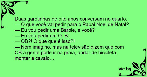 — Nem imagino, mas na televisão dizem que com OB a gente pode ir na praia, andar de bicicleta, montar a cavalo…
