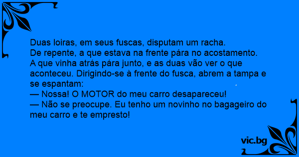 A que vinha atrás pára junto, e as duas vão ver o que aconteceu. Dirigindo-se à frente do fusca, abrem a tampa e se espantam: