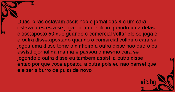Duas loiras estavam assisindo o jornal das 8 e um cara estava prestes a se jogar de um edificio quando uma delas disse;aposto 50 que guando o comercial voltar ele se joga e a outra disse;apostado quando o comercial voltou o cara se jogou uma disse tome o dinheiro a outra disse nao quero eu assisti ojornal da manha e passou o mesmo cara se jogando a outra disse eu tambem assisti a outra disse entao por que voce apostou a outra pois eu nao pensei que ele seria вurrо de pular de novo