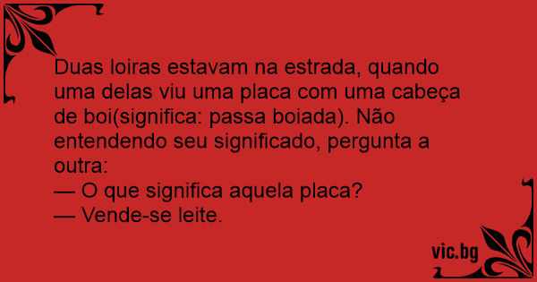 Duas loiras estavam na estrada, quando uma delas viu uma placa com uma cabeça de boi(significa: passa boiada). Não entendendo seu significado, pergunta a outra: