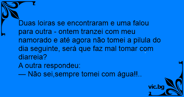 Duas loiras se encontraram e uma falou para outra - ontem tranzei com meu namorado e até agora não tomei a pilula do dia seguinte, será que faz mal tomar com diarreia?
