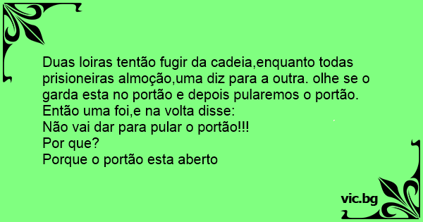 Duas loiras tentão fugir da cadeia,enquanto todas prisioneiras almoção,uma diz para a outra. olhe se o garda esta no portão e depois pularemos o portão.