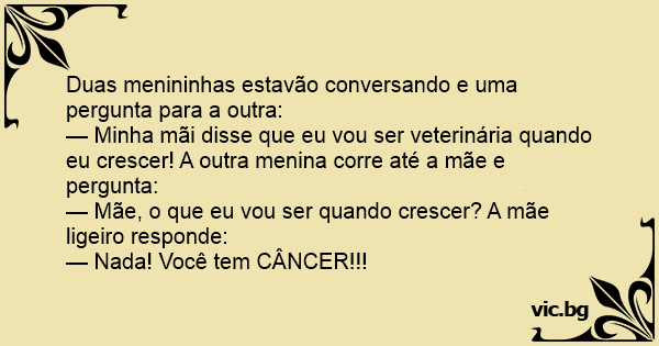 — Minha mãi disse que eu vou ser veterinária quando eu crescer! A outra menina corre até a mãe e pergunta: