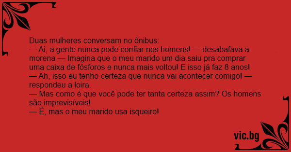 — Ai, a gente nunca pode confiar nos homens! — desabafava a morena — Imagina que o meu marido um dia saiu pra comprar uma caixa de fósforos e nunca mais voltou! E isso já faz 8 anos!