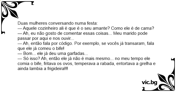— Ah, então fala por código. Por exemplo, se vocês já transaram, fala que ele já comeu o bife!