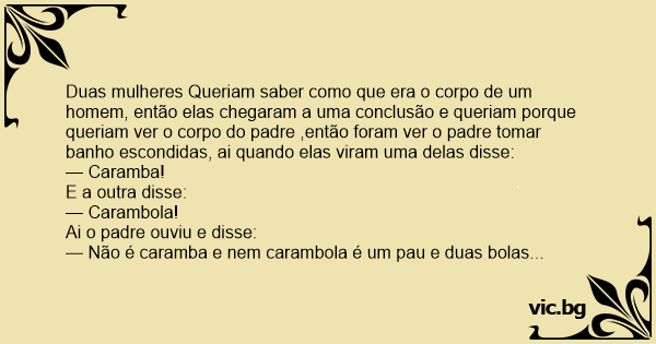 Duas mulheres Queriam saber como que era o corpo de um homem, então elas chegaram a uma conclusão e queriam porque queriam ver o corpo do padre ,então foram ver o padre tomar banho escondidas, ai quando elas viram uma delas disse: