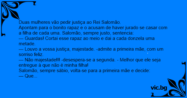 Apontam para o bonito rapaz e o acusam de haver jurado se casar com a filha de cada uma. Salomão, sempre justo, sentencia: