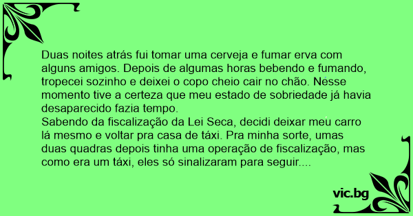 Sabendo da fiscalização da Lei Seca, decidi deixar meu carro lá mesmo e voltar pra casa de táxi. Pra minha sorte, umas duas quadras depois tinha uma operação de fiscalização, mas como era um táxi, eles só sinalizaram para seguir. Surpreendentemente cheguei em casa são e salvo.