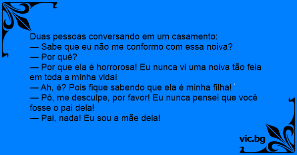 Le comenta un cuate a alguien en una boda: ¡Oiga!, ¿Ya se fijó que la novia es bastante horrible la pobre? ¡Óigame! ¿Pues qué le pasa? ¡No se exprese así que es mi hija! ¡Ay usted perdone!, no pensé que usted fuera el papá! Y no soy el papá, soy la mamá.