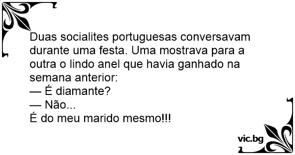 Duas socialites portuguesas conversavam durante uma festa. Uma mostrava para a outra o lindo anel que havia ganhado na semana anterior: