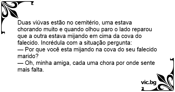 Duas viúvas estão no cemitério, uma estava chorando muito e quando olhou paro o lado reparou que a outra estava mijando em cima da cova do falecido. Incrédula com a situação pergunta: