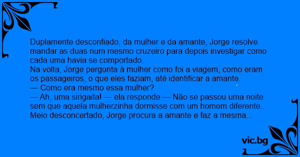 — Ah, uma sirigaita! — ela responde — Não se passou uma noite sem que aquela mulherzinha dormisse com um homem diferente...