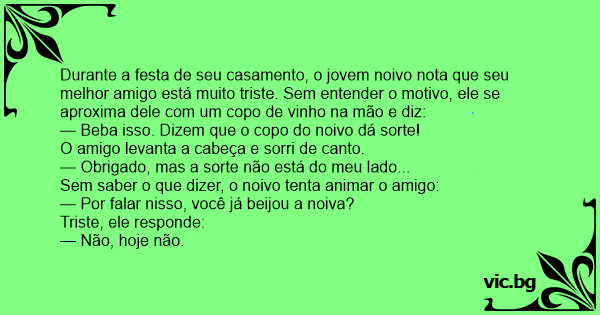 Durante a festa de seu casamento, o jovem noivo nota que seu melhor amigo está muito triste. Sem entender o motivo, ele se aproxima dele com um copo de vinho na mão e diz: