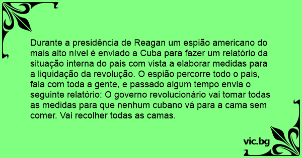 Durante a presidência de Reagan um espião americano do mais alto nível é enviado a Cuba para fazer um relatório da situação interna do pais com vista a elaborar medidas para a liquidação da revolução. O espião percorre todo o pais, fala com toda a gente, e passado algum tempo envia o seguinte relatório: O governo revolucionário vai tomar todas as medidas para que nenhum cubano vá para a cama sem comer. Vai recolher todas as camas.