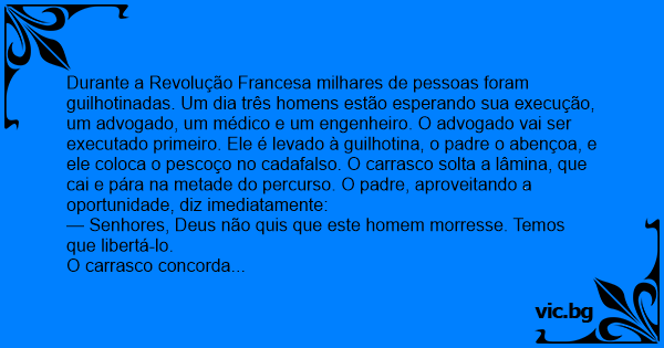 Durante a Revolução Francesa milhares de pessoas foram guilhotinadas. Um dia três homens estão esperando sua execução, um advogado, um médico e um engenheiro. O advogado vai ser executado primeiro. Ele é levado à guilhotina, o padre o abençoa, e ele coloca o pescoço no cadafalso. O carrasco solta a lâmina, que cai e pára na metade do percurso. O padre, aproveitando a oportunidade, diz imediatamente: