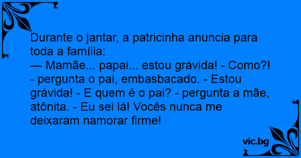— Mamãe... papai... estou grávida! - Como?! - pergunta o pai, embasbacado. - Estou grávida! - E quem é o pai? - pergunta a mãe, atônita. - Eu sei lá! Vocês nunca me deixaram namorar firme!