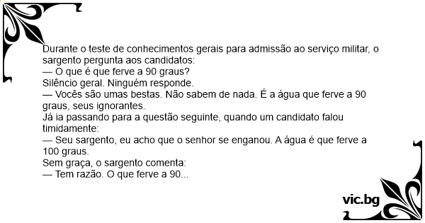 — Seu sargento, eu acho que o senhor se enganou. A água é que ferve a 100 graus.