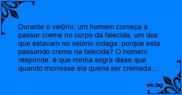 Durante o velório, um homem começa a passar creme no corpo da falecida, um dos que estavam no velório indaga: porque esta passando creme na falecida? O homem responde: é que minha sogra disse que quando morresse ela queria ser cremada...