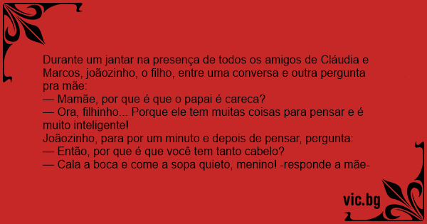 Durante um jantar na presença de todos os amigos de Cláudia e Marcos, joãozinho, o filho, entre uma conversa e outra pergunta pra mãe: