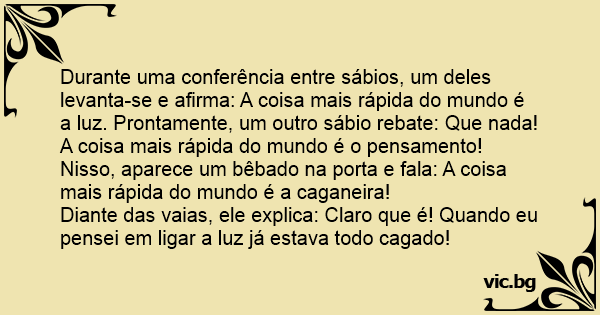 Durante uma conferência entre sábios, um deles levanta-se e afirma: A coisa mais rápida do mundo é a luz. Prontamente, um outro sábio rebate: Que nada! A coisa mais rápida do mundo é o pensamento!