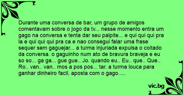 Durante uma conversa de bar, um grupo de amigos comentavam sobre o jogo da tv... nesse momento entra um gago na conversa e tenta dar seu palpite... e qui qui qui pra la e qui qui qui pra ca e nao consegui falar uma frase sequer sem gaguejar... a turma injuriada expulsa o coitado da conversa. o gaguinho num ato de bravura braveja e eu so so... ga ga... gue gue.. Jo. quando eu.. Eu.. que.. Que.. Ro.. van.. van.. mos a pos pos... tar. a turma louca para ganhar dinheiro facil, aposta com o gago.. - vai ate o balcao e pede uma cerveja, se voce nao gaguejar voce ganha.. o gago vai ate o balcao... respira fundo e grita num folego so: