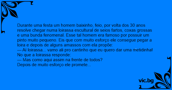 Durante uma festa um homem baixinho, feio, por volta dos 30 anos resolve chegar numa loirassa escultural de seios fartos, coxas grossas e uma bunda fenomenal. Esse tal homem era famoso por possuir um pinto muito pequeno. Eis que com muito esforço ele consegue pegar a loira e depois de alguns amassos com ela propõe: