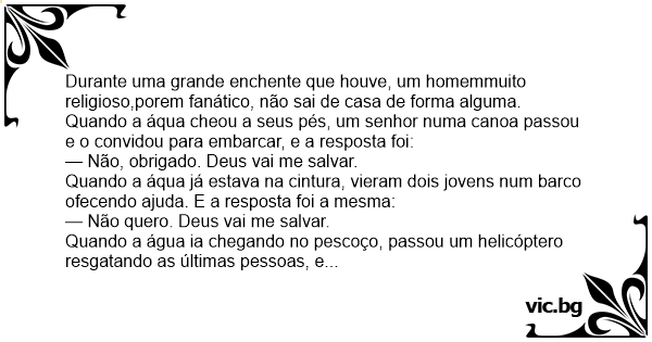 Durante uma grande enchente que houve, um homemmuito religioso,porem fanático, não sai de casa de forma alguma. Quando a áqua cheou a seus pés, um senhor numa canoa passou e o convidou para embarcar, e a resposta foi: