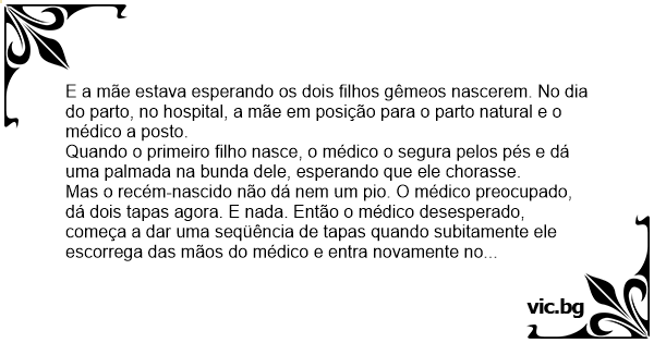 Mas o recém-nascido não dá nem um pio. O médico preocupado, dá dois tapas agora. E nada. Então o médico desesperado, começa a dar uma seqüência de tapas quando subitamente ele escorrega das mãos do médico e entra novamente no ventre de sua mãe.