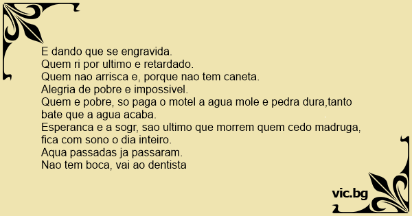 Quem e pobre, so paga o motel a agua mole e pedra dura,tanto bate que a agua acaba.
