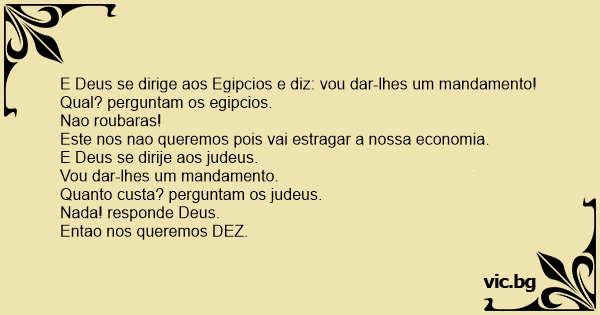 E Deus se dirige aos Egipcios e diz: vou dar-lhes um mandamento! Qual? perguntam os egipcios. Nao roubaras! Este nos nao queremos pois vai estragar a nossa economia. E Deus se dirije aos judeus. Vou dar-lhes um mandamento. Quanto custa? perguntam os judeus. Nada! responde Deus. Entao nos queremos DEZ.