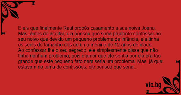 E eis que finalmente Raul propôs casamento a sua noiva Joana. Mas, antes de aceitar, ela pensou que seria prudente confessar ao seu noivo que devido um pequeno problema de infância, ela tinha os seios do tamanho dos de uma menina de 12 anos de idade.