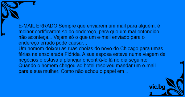 E-MAIL ERRADO Sempre que enviarem um mail para alguém, é melhor certificarem-se do endereço, para que um mal-entendido não aconteça... Vejam só o que um e-mail enviado para o endereço errado pode causar...