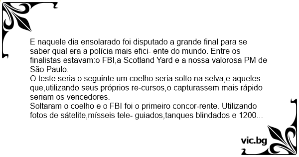 E naquele dia ensolarado foi disputado a grande final para se saber qual era a polícia mais efici- ente do mundo. Entre os finalistas estavam:o FBI,a Scotland Yard e a nossa valorosa PM de São Paulo.