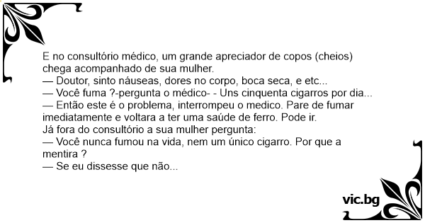 — Então este é o problema, interrompeu o medico. Pare de fumar imediatamente e voltara a ter uma saúde de ferro. Pode ir.