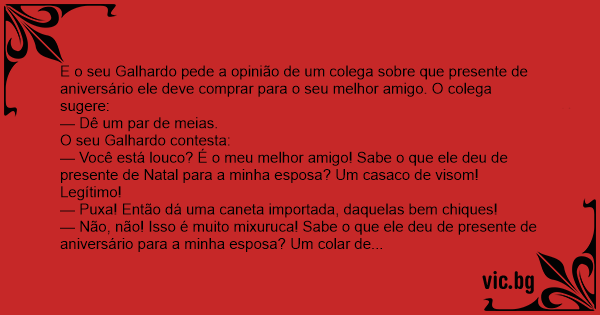 E o seu Galhardo pede a opinião de um colega sobre que presente de aniversário ele deve comprar para o seu melhor amigo. O colega sugere: