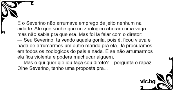 E o Severino não arrumava emprego de jeito nenhum na cidade. Ate que soube que no zoologico abriram uma vaga mas não sabia pra que era. Mas foi la falar com o diretor: