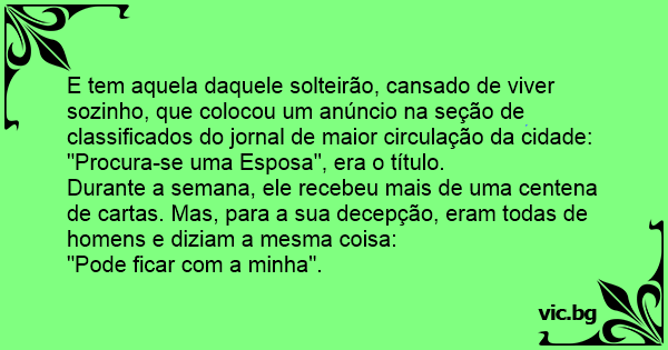 E tem aquela daquele solteirão, cansado de viver sozinho, que colocou um anúncio na seção de classificados do jornal de maior circulação da cidade: