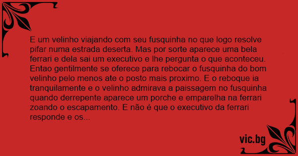 E um velinho viajando com seu fusquinha no que logo resolve pifar numa estrada deserta. Mas por sorte aparece uma bela ferrari e dela sai um executivo e lhe pergunta o que aconteceu. Entao gentilmente se oferece para rebocar o fusquinha do bom velinho pelo menos ate o posto mais proximo. E o reboque ia tranquilamente e o velinho admirava a paissagem no fusquinha quando derrepente aparece um porche e emparelha na ferrari zoando o escapamento. E não é que o executivo da ferrari responde e os dois partem pra um racha correndo como doidos, e a ferrari encostando no porche e o velinho la atras rebocado buzinando no desespero. Derrepente passam num posto policial e o guarda corre para o radio e passa logo o comunicado: