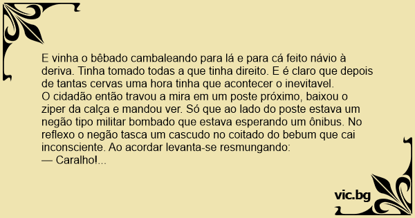 E vinha o bêbado cambaleando para lá e para cá feito návio à deriva. Tinha tomado todas a que tinha direito. E é claro que depois de tantas cervas uma hоrа tinha que acontecer o inevitavel.