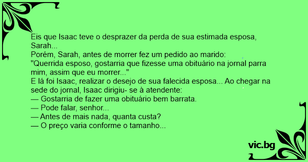 E lá foi Isaac, realizar o desejo de sua falecida esposa... Ao chegar na sede do jornal, Isaac dirigiu- se à atendente: