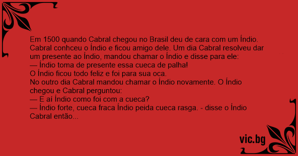 Em 1500 quando Cabral chegou no Brasil deu de cara com um Índio. Cabral conhceu o Índio e ficou amigo dele. Um dia Cabral resolveu dar um presente ao Índio, mandou chamar o Índio e disse para ele: