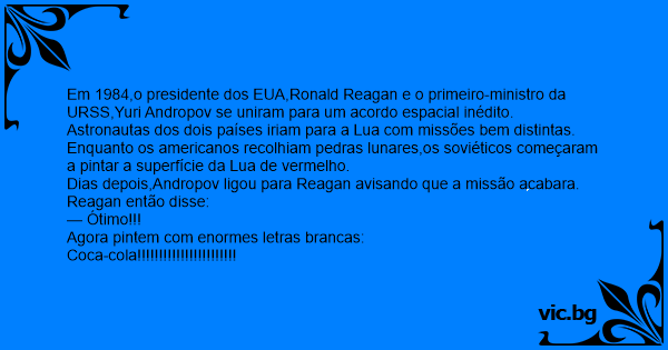 Em 1984,o presidente dos EUA,Ronald Reagan e o primeiro-ministro da URSS,Yuri Andropov se uniram para um acordo espacial inédito.